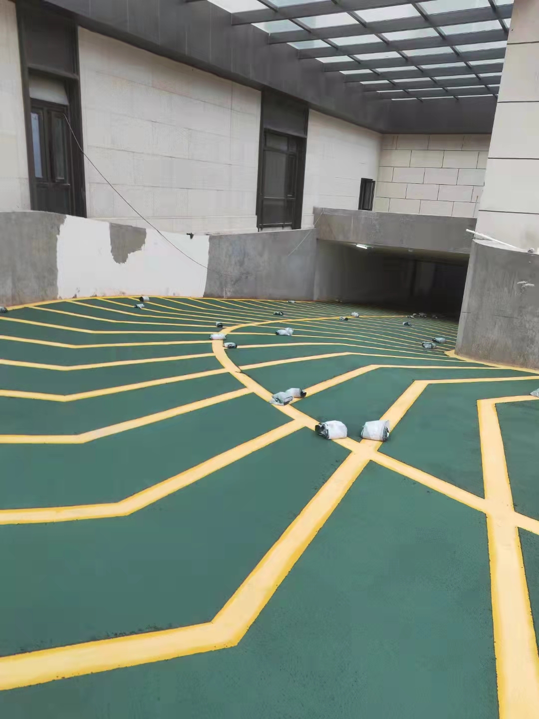 無震動防滑坡道材料抗壓層施工結束后粘貼美紋紙,間隔有80-100cm左右,具體按實際情況測量平均分。美紋紙,正在施工的無震動防滑坡道材料,美觀耐磨" />