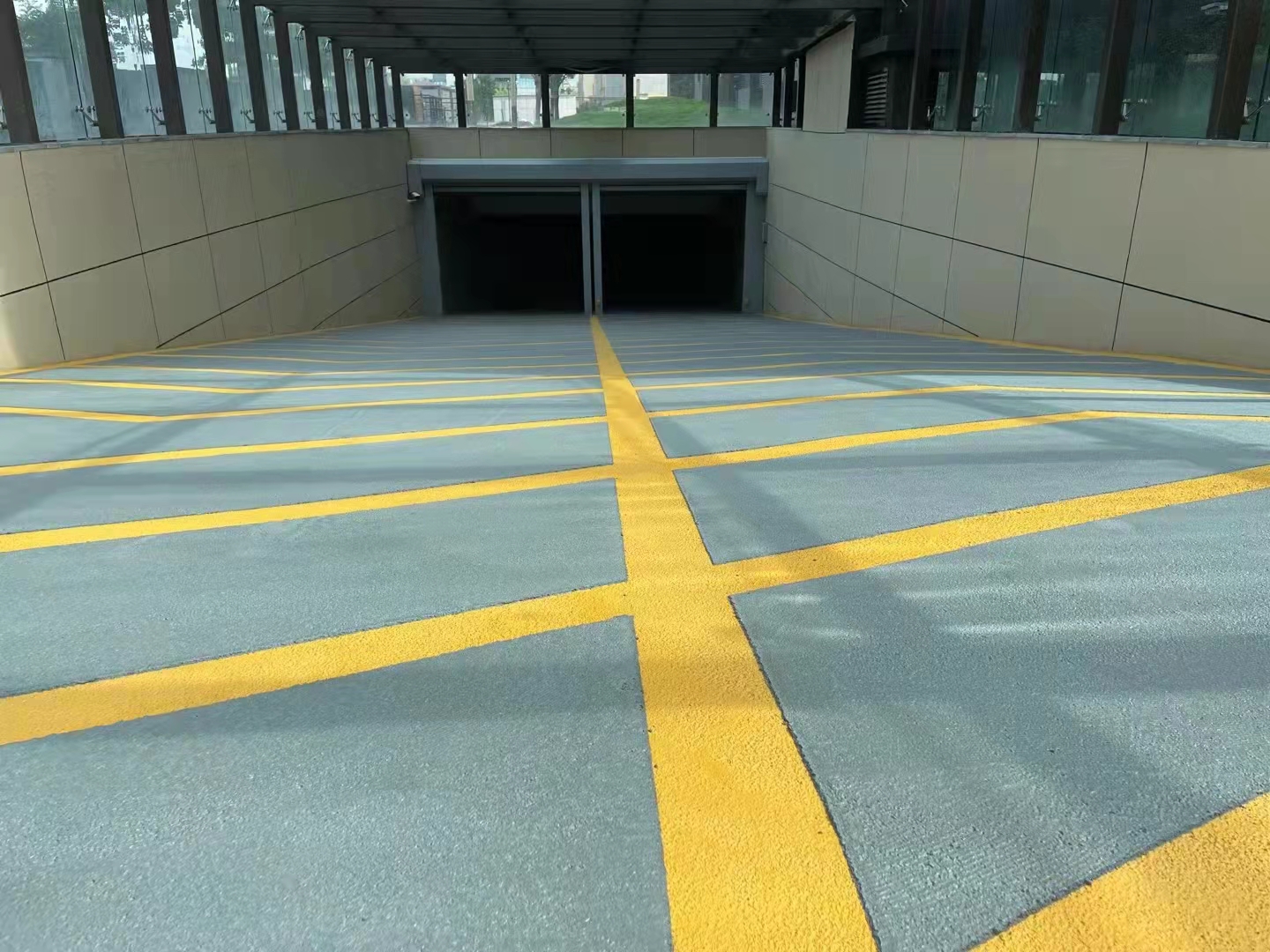 無(wú)震動(dòng)防滑坡道材料施工分為兩層,先平鋪一遍黃色抗壓層,大概2mm厚度,作用是保護(hù)基礎(chǔ)地面不被磨損,另一個(gè)作用是承受基礎(chǔ)的壓力,延長(zhǎng)防滑坡道的使用時(shí)間。黃色抗壓層做好之后粘貼美紋紙,用于設(shè)計(jì)車庫(kù)進(jìn)出的導(dǎo)向箭頭,間隔在80-100cm,按整體長(zhǎng)度平均分。