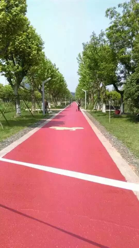 人行步道彩色路面施工簡(jiǎn)單,根據(jù)厚度要求確定用量,材料用量確定后開始施工。綠道樹脂批刮過(guò)程中滿撒彩色骨料,干燥后噴灑罩面劑即可。